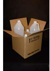 The shipping box holds four, 1 gallon round polyethylene bottles. Included in the shipping box is a divider insert for a tight and secure fit when shipping. It has printed warnings "This Side Up" and "Liquid Handle With Care" on the sides.