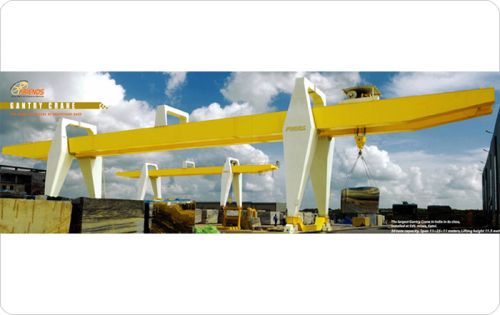Rational structure is of box construction, adequately designed and reinforced by stiffening ribs, to take care of all types of loadings. This is connected by cross beams. The unbraced legs are hinged near the leg beam attachment. The complete structure is mounted on four wheel base, each having two double rimmed steel wheels provided with flexible bushing to take care of any misalignment. The top beam is firmly fixed on heavily fabricated steel bracket. The crab carriage is in steel section. It is comprised of special crane duty motor, connected to heavy duty speed reducers and are coupled up to a grooved steel drum.electromagnetic brakes hydro-thruster brakes are used to control the smooth lifting of weight. The block is equipped with a forged steel forked revolving hook.