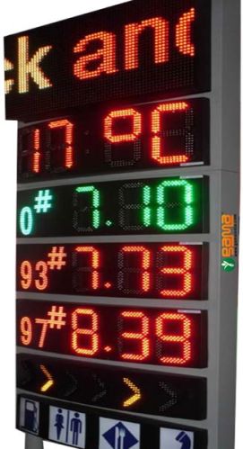 we are offering gas price sign. 1. operating voltage:- 100-275v a.c., 5060 hertz, view angle more than 120 degree, view distance 300mtr. 2.high intensity led display 3.radio frequency remote controlled having range of 500mtr 4.solara.c. powered 5.computer controlled- data files can be saved 6.u.s.b connectivity.