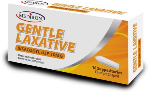 Gentle laxative has comfort shaped medicated suppository.