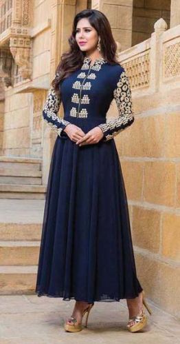 We are offering georgette embrodary work dark blue semi stitched anarkali suit. Georgette top:dark blue,santoon bottom:blue,georgette dupatta:dark blue,inner:rosilk,size:1.90 mtr top,2.25 mtr bottom,2.25 mtr dupatta,pattern:embroidered ,occasion:casual wear,hand wash only anarkali type suit.