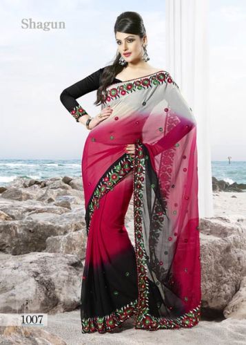 we are offering georgette sarees. exuberant colour and exotic patterns for the gorgeous you. if you are looking for some style statement then try this magenta georgette saree with blouse. this saree is beautifully designed with resham, lace, stone and patch work. as shown blouse can be made available and also can be customized as per your style or pattern subject to fabric limitation. slight variation in color and patch patti is possible.