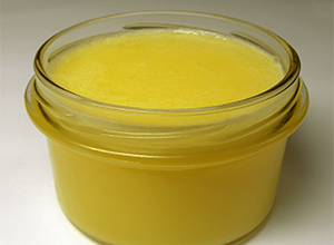 Ghee is a class of clarified butter that originated in ancient India and is commonly used in traditional medicine and religious rituals. Ghee is prepared by simmering butter, which is churned from cream, and removing the liquid residue.
