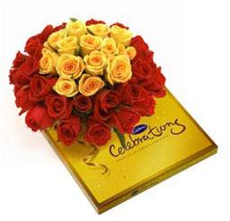 We are offering gift hamper. Steal someones heart with the luxury of roses and sweetness of chocolates. Hamper includes bunch of 12 red and yellow roses and pack of 162.6 gms of cadbury celebration chocolates.