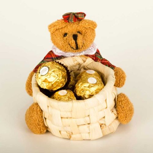 Discover the tempting layers of Ferrero Rocher, a whole hazelnut with smooth chocolaty cream inside a wafer shell, covered in milk chocolate and hazelnut pieces. Perfect gift to gift your Valentine Contents : - 1 Teddy - 5 Piece Ferrero Rocher Chocolates - Note :Colour of the Teddy May Vary.