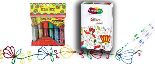 Creations Glitter colours can be used in various kinds of craft activities, on different surfaces like, paper, wood, clay, glass, plastic, leather and metal for decoration Have fun using Creations Glitter colours to create greeting cards, fan tattoos, gift tags, torans, pots, masks, wall hanging, bags and many more things. Creations Glitter colours are Non-Toxic