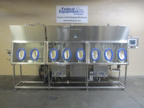 Used Carlisle Life Sciences isolator, 316L stainless steel construction, approximately 166" over all length with 112" long wash section and 48" dry section, single sided with (6) glove ports in wash section, (2) glove ports in dry section, (1) 21" x 18" x 18" deep wash sink with integrated model 5300 Ultrasonic bath, (2) 21" x 18" x 18" deep wash sinks, 10" wash side feed port, 17" wide x 21" high pass thru with door, 17" wide x 21" high dry side exitaccess with door, on stand, serial# 32762-1, built