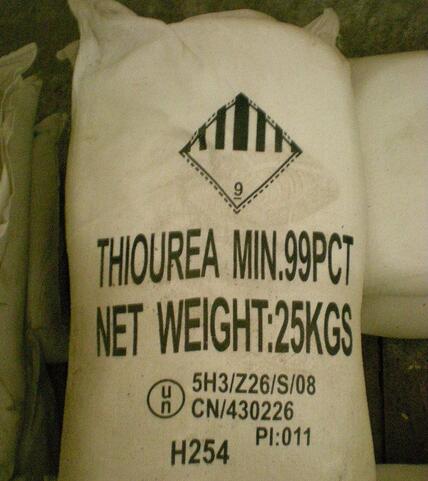 Contact SupplierGold mining usage chemical thiourea gold minning, bleaching agent in textile dyeing and printing, auxiliary of dyeing and anti-oxidant, rubber accelerator, pharmaceutical raw material, photo developing agent, resin compression molding, powder electroplating, blue pringting and boiler washing, macromolecule material industry, castallysis and stabilizerof resinic producing, organic synthesization of sensitizing material, and medicine, medical, spicery materials in fine chemicas, recycling and separating of heavy metals etc. Molecular formula: ch4n2s       molecular weight: 76.12 properties: pure product is colorless rhombic powder, bitter, density1.40g/cm3, melting point 170-171°csublimation in 150-160 °cuses: 1, thiourea can be used in drug and feed additive 2, bleaching agent and floatation agent of metallic mine3, dyeing auxiliary; 4, rubber accelerator; 5, developer and toner; 6, plating additive; 7, used in the production of gold and electrolytic copper; 8, material of resin pressed powder; 9, used to produce cold wave lotion; 10, used to produce thiourea dioxide ; 11, chemical reagent; 12, blueprint used in blueprint and clean boiler. Packing: in plastic bag lined plastic woven bag, net wt 25kg. Item metrical unit standard actual results purity % 99.0 min 99.15 loss on heating % 0.40 max 0.20 ash content % 0.10 max 0.05 water-insoluble % 0.02 max 0.01 thiocyanate % 0.02 max 0.018 melting point.