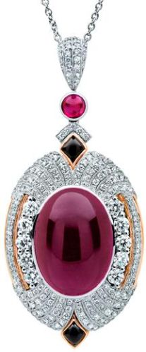 We offer gold necklaces. 18k white and rose gold with an intense 29.81ct pink oval rubellite cabochon, 3.71ct de vvs round brilliant cut diamonds and custom cut onyx