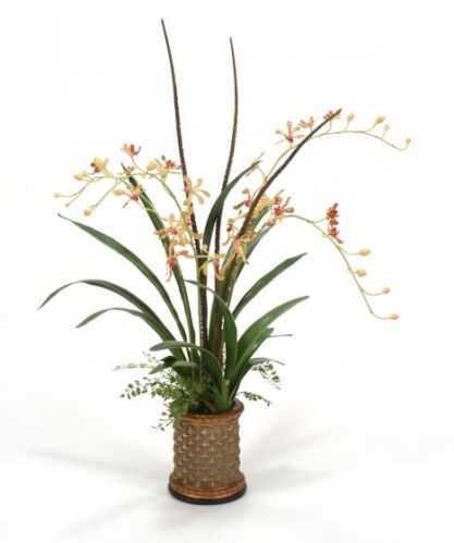 6052# - Gold Vanda Orchids with Mixed Foliage in Cylinder Planter Gold Vanda Orchids with Mixed Foliage in Cylinder Planter Container Material Resin Dimensions Height" x Width" x Depth" 37 x 33 x 36 Dominant Color Mustard Dominant Color Family Yellows Shipping Weight 30 Ships