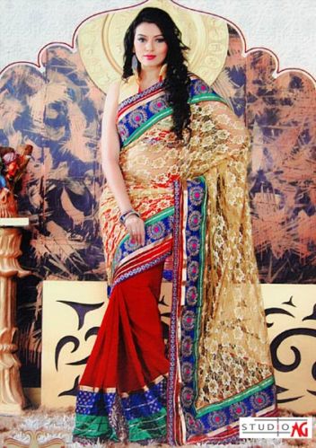 We are offering golden and red net and georgette saree. golden and red net and georgette saree designed with resham, zari highlighted work, heavy blue and green border and comes with golden colour blouse fabric.