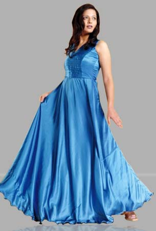 One Piece: This mesmerizing evening gown in such a brilliant blue color has a perfect combination of style and poise. With pleated pattern this one is surely graceful. Fabric: Satin with Cotton Lining.
