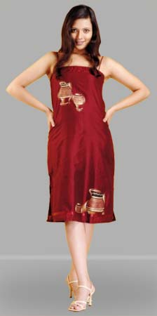 One Piece: This adorable strappy one piece is quite subtle yet has a unique appeal. Exquisitely hand painted in a very innovative style, this one is sure to make its mark at a single glance. Fabric: Maroon Washable Silk with Cotton Lining.