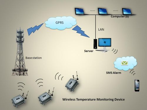 Wireless temperature monitoring device transmits temperature data to network through GPRS directly.
