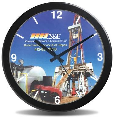 This 14" Wall Clock provides billboard like brand exposure 24 hours a day. It has a huge 11-34" diameter imprint area which can be printed with a full bleed and up to 4 color process graphics. 1 color to 4 color process imprint is included in the price with only one low setup charge. Disclaimer: Please note factory only offers black clock hands which are automatically supplied. Dark clock backgrounds are not advisable as Black hands may not be visible. Made and assembled in US. 14" Diameter