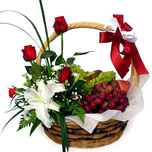 We are offering grapes flower basket. A basket of grapes with flower arrangement. basket includes: green grapes (1k) red grapes (1k) red roses (3pcs) white lily (1pcs) green fillers.