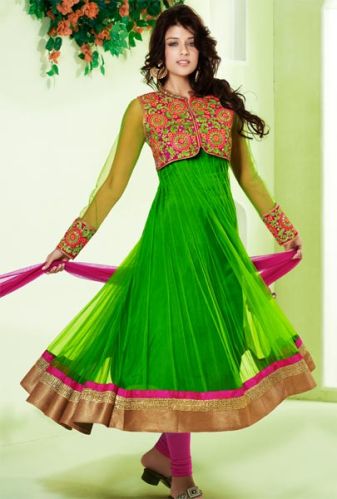 This attractive neon green anarkali is a must this wedding season. The pink embroidered jacket adds glamour to this outfit. The net fabric assures pure comfort. This set comprises kameez, churidar and a pink net dupatta. Model : SGB-201 Price : 9005 Availability : 1 Weight : 0.50 Kg Quantity