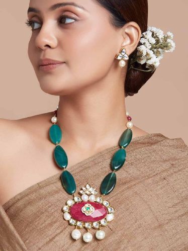 Contact SupplierThis elegant necklace set in green and multi-colour is made with green agate tumbles, red onyx, hydro polkis and white baroque pearls. Suitable for festive events where you wear traditional clothing. The necklace has a closure to adjust the length by 2 inches + or - the ordered size.