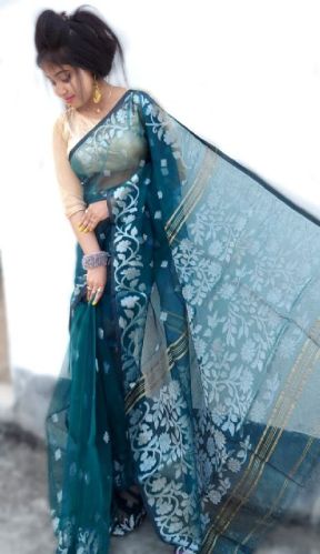 Unstitched Cyan Muslin Silk Saree, Width : 5.5 Meter