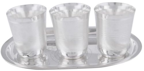 We are offering gsm silver plated juli diamond glass set with oval tray 4 pcs. ( 17cmx26cmx9cm). "this glass set is manufactured by our craftmen using high grade raw material. It is widely used for serving juices, water etc. To guests and gives a rich look. It is praised among people for its varied features, such as eye catching looks, excellent finishing and superb shine. Disclaimer: product colour may slightly vary due to photographic lighting sources or your monitor settings. Note: no warranty for silver coating. "