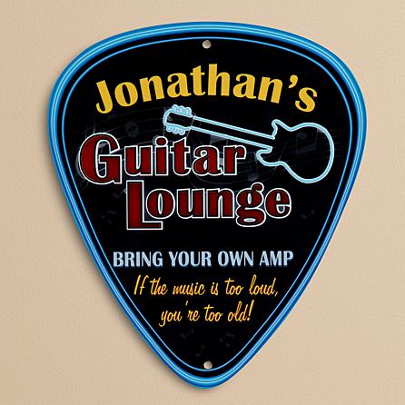 A Personal Creations Exclusive! Surprise any guitarist or rock fan with our custom guitar pick shaped sign. We personalize with any name up to 12 characters. Made of 18"" tempered hardboard with a glossy laminate finish and comes with two pre-drilled holes for easy hanging. Measures 10"Hx11 14"W. Apostrophe is not automatically added. Please add this to your personalization if you wish for it to appear. Item