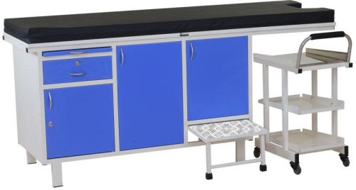 Overall approx. Size : L 1830 mm x W 575 mm x H 850 mm. Frame : CRCA Rectangular Tubes, CRCA sheet cabinets. Three cabinets one with lock & one drawer with lock. 100 mm thick reversible foam mattress with ‘U’ cut.  Pre-treated & Epoxy powder coated. Sliding step stool & writing pad. Optional : Lock facility for remaining Cabinets.