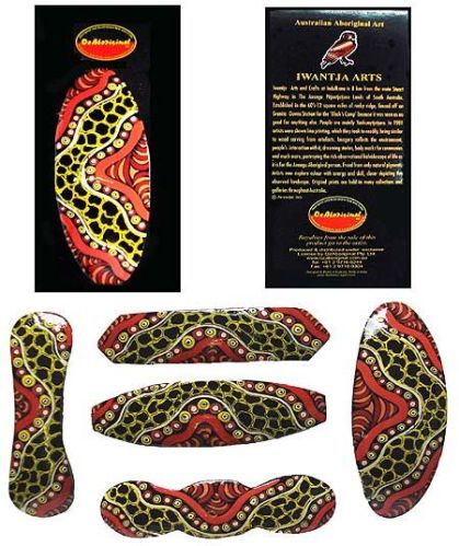Striking painted laquered hair clipp depicting dreamy butterfly design by trish singer- iwantja arts the anangu people have special ties to totemic sites in the area and paint their connection to it. Artists use symbolism from their own individual dreaming path, single and concentric circles, animal tracks and straight and curved lines.