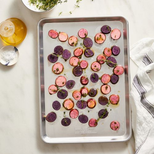 An essential for every kitchen, this durable pan is perfect for everything from roasting vegetables and making crisp-crusted pizza to whipping up a batch of golden-brown chocolate chip cookies. Made with heavy-gauge aluminum, it’s durable and conducts heat uniformly and quickly. The sheet features wire-reinforced rims with round corners that allow for easier cleanup. As an added bonus, it’s just the right size for Blue Apron’s Family plan recipes.