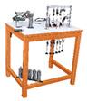 TE-5831-HAND EXERCISE TABLE: Hard-wood table with laminated top, size 24"x 30"x 30" high. Fitted with 6 pulleys in a steel frame. Leather loops and nylon cord passing through the pulleys with hanging weight underneath for Fingers Hand, Wrist and Forearm exercises. Especially for Metacarpophalangeal and Interphalangeal joints. Provided with Supinator/Pronator and Wrist-Circum- duction wheel for Wrist exercises. Comes with Five sets of weights, each set consists of 5 weights of One each of 100, 200, 300, 400 and 500 grms.