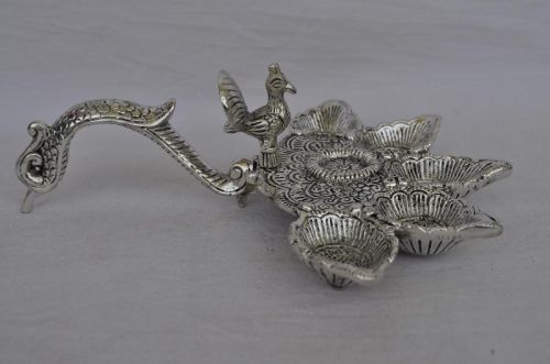 Contact SupplierWe offer hand held white metal five face oil lamp, agradan diya, pooja aarti with peacock figure.