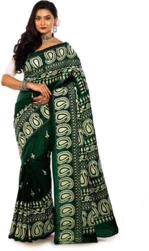 Contact SupplierKantha stitch is a traditional form of making thread work on fabrics in Bengal. This is a beautiful bottle green Bangalore silk saree. This saree is purely designed with traditional kantha stitch in white, creating a mesmerising combination. The design of the borders is in 4 horizontal segments. It has kalkas, checkered and alpona design in tapestry pattern. The same is in the pallu in repeated manner. The motifs in the body are typical alpona designs. Another is a similar peacock blue saree with floral motifs and alpona designs. The flowers are hand stitched with filling stitches and the alponars are done in run stitch. The pallu has a dense floral work. The other saree is a maroon one with multi colour thread work. The borders and pallu have dense floral deisgn and the motifs in the body are like the bottle green saree. All these sarees have blouse piece.