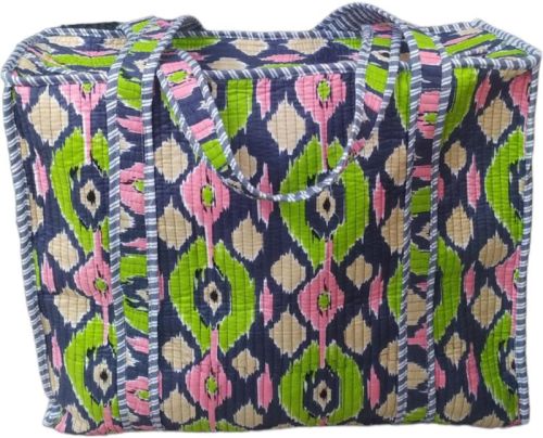 Contact SupplierSize: 17x18x 6 inches Print & Pattern: Handblock Printed & QuiltedÊ Zip: Yes, concealed Zip Pockets : 1 Internal Pocket Wash Care: Machine Wash Safe, Fade proof Introducing our exquisite handblock printed quilted tote bag Ð a perfect blend of style and functionality. Designed with convenience in mind, this tote features spacious compartments, making it ideal for daily essentials or a quick weekend getaway. The sturdy handles provide comfort during extended use, and the quilted exterior adds an extra layer of protection. Whether you're headed to the office, a shopping spree, or a casual outing, our handblock printed quilted tote bag is the perfect companion, offering a harmonious blend of elegance and practicality. Upgrade your accessory collection today with this one-of-a-kind, artisan-crafted tote.
