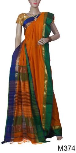 Made of silk and cotton,Golden yellow colour saree with wide Green & Blue border on pallu with zari & jute work - look even more beautiful. It is also known for one of India’s finest fabric, and handloom weaving – Handloom (silkcotton) Maheshwari Saree. The graceful & sophisticated design is inspired by the local architecture and striped pallu. Once an exclusive privilege of the royalty has become an established choice of the woman. Free unstitch Blouse piece of this saree.