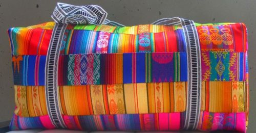 We are offering handmade bags. Colorful stripes of fabric piece together 12 uniquely designed blankets allowing for a collage of weaved artwork in one bag. Embellished with colorful stripes with symbols representing native values. Genuine material. soft colorful textile measurements: 20" x 10" x 8" (inches) insulated interior durable fabric