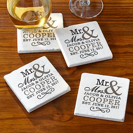 Of timeless beauty and exceptional quality, our stone coasters make an unforgettable wedding or anniversary gift. Tumbled stone with chiseled edges. Protective cork backing. Personalize with any 2 names up to 9 characters each, last name up to 12 characters and date. "Mr. & Mrs." will always appear. "&" will always appear. “Est.” will always appear. Measures 4" sq. each. Set of 4. Choose from coasters only or coasters with holder. Item