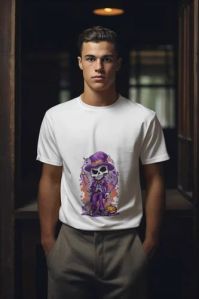 Contact SupplierGet spooky in style with the Haunted Hustler t-shirt! This crisp white tee features a sharp-dressed skeleton in a purple gangster suit and fedora, complete with a cane and Halloween pumpkin at his feet. The graffiti-style backdrop adds extra attitude, making it perfect for festive parties or streetwear enthusiasts who like a little fright with their fashion. Crafted from premium-quality cotton for a soft, breathable feel.