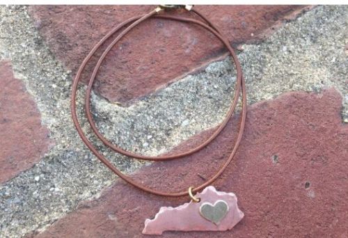 This copper Kentucky necklace with brass heart is handmade. Each copper Kentucky is hammered around the edge and brass heart attached to the center. A genuine leather cording is used for the necklace. (Choice of 16 or 18 inch length).