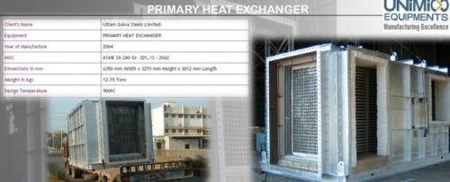 Offering Heat Exchangers. Client’s Name - Uttam Galva Steels Limited. Equipment - PRIMARY HEAT EXCHANGER Year of Manufacture - 2004 MOC - ASME SA 240 Gr. 321, IS – 2062 Dimensions in m - 6350 mm Width x 3270 mm Height x 3012 mm Length Weight in kgs - 12.75 Tons Design Temperature - 9000C