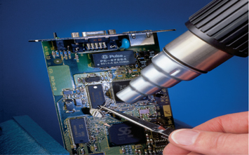 Desoldering electronic components from faulty circuit boards is possible with tatgeted flow of hot air gun. Use of reduction nozzle and clamp the circuit board in a vice. after heating the solder point (to approx. 280 deg celsius) you can remove the components with pair of pincers. As high temperature irreparably damage semicondustors, it is only recommended to use hot air on defected circuit boards.