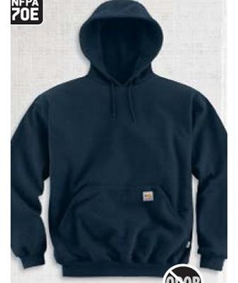Anti-odor control. Attached hood with adjustable draw-cord closure. Front hand-warmer pocket. Carhartt FR and HRC 3 labels sewn on pocket. Meets the performance requirements of NFPA 70E. Inherently flame-resistant fabric. Complies with ATPV, NFPA, UL.