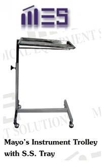 We are offering mes ot mayo instrument trolley with ss tray. Overall size in the range of : 56 x 40 (lb), height fixed at or adjustable as 76 to 127 cm as per preference, tray size : 91 x 50 cm or 56 x 40 cm as per prefrence, tray made up of 0.9 mm thick ss grade 304, height adjustable by knob or gear mechanism as per preference, options of ss frame is availble, 50 mm diameter castor for mobility, 22 swg ms/ ss shelves as per preferences, pre-treated & epoxy powder coating for scratch proof finish, standard : iso , ce
