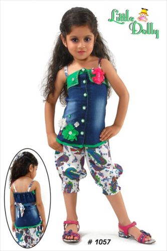 we offer heram & top -- material used - a combination of denim & lycra with print gives a elegant look. colors available - 1> green 2> red size available - 20' to 30' (2-7 years)
