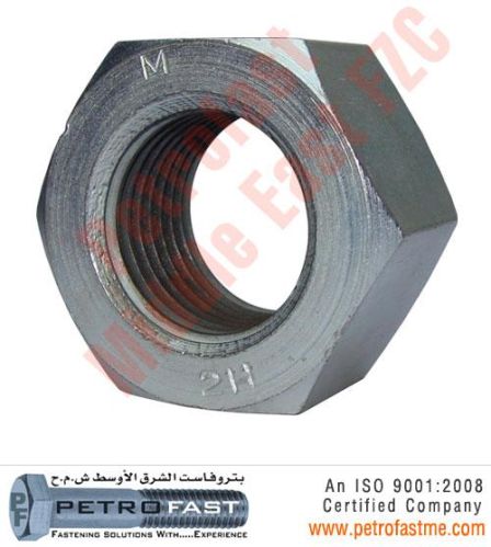 Hex Nut: Sizes ranging from m3 to m100; 14” to 4”. Dimensions as per ASME ANSI B18.2.2 ASME B18.2.4.6M for nuts. Finish: black, zinc plated, HDG, PTFE coated, ENP coated. Properties confirming to ASTM A194 Gr.2H, 2HM, 7, 7M, B16, A563M -10S Din 934 ISO 4032 BS3692 BS4190 , CL. 4, 8, 10 & 12 and more. Stainless steel AISI 304 316, ASTM A194 Gr.88m 8MA and various other grades.