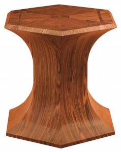 Hexxus is the second dining table offered in our new line of wood veneered products. A six-sided table, with an hourglass shape, and a 1-12” beveled top. Pictured above veneered in Rosewood with our standard lacquer finish and measuring 30” flat to flat and 28” hoa. Hexxus can be fabricated with any of our 19 veneers and in any size and height. Levelers and recessed casters are available.