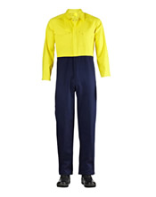 Hi vis two tone raglan sleeve coverall fabric: 100% cotton weight: 310gsm side slant pockets,back right pocket, left chest pocket with ,tool pocket with mobile phone pocket on lower right leg.