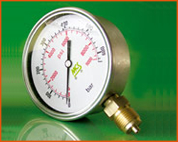 Working pressure: steady: 75% of full scale value, Working temperature range : ambient: -25°C a 65°C, Overpressure: 25% 100bar, Casing body: liquid filled in stainless steel case with safety vent. Band ring: stainless steel AISI 304, Fissing flange: stainless steel AISI 304 with 3 holes, Dial: white painted aluminium with indelible black and red graduation MCS green mark, Needle: black painted aluminium, Transparent cover: polycarbonat, Connection: brass for pressure up to 600bar