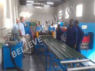 this roof panel forming machine is suitable for manufacturing colored steel roofing panel. The machine includes decoiler, roll former, cutter, hydraulic pump station, product table, and cabinet, etc.