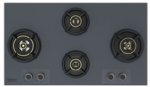 Flame Failure device Flame guard Pan Support 8 mm toughened glass with Matt Finish in Grey color Elegant Golden Metallic Knob Golden bidding on glass for premium look Designer Fully Brass Burner Auto Ignition