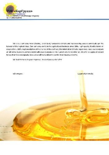We are a company from Ukraine, lavish land, temperate climate and hardworking people contribute get the harvest of the highest class. Our company works in the agricultural business since 2008, high-quality, flexible terms of cooperation, 100% implementation of the terms of the contract, the international trade experience make our company an attractive business partner. Work with your company will be a great achievement for us. We offer a supply of natural honey from the ecologically clean area without antibiotics on the most favorable terms.