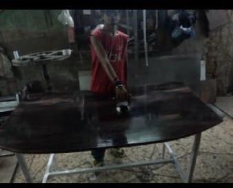 Horizontal sanding table: wooden sanding top is fitted on an tubular frame, having two cut-outs to accommodate two patients. One side is fitted with bar to attach elastic straps for resistive exercises. Comes complete with two sanding blocks and four elastic straps. Size: 115cm x 75cm x 75cm high.